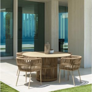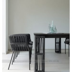 Bàn ăn ngoài trời cao cấp SKLT014 đi kèm ghế ăn ngoài trời cao cấp trong cùng bộ sưu tập, sử dụng khung nhôm sơn tĩnh điện đan dây dù cao cấp chống tia UV, chịu thời tiết tốt, ghế có đệm ngồi bọc vải ngoài trời trượt nước.