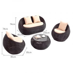Bộ sofa mây ngoài trời hình quả trứng SKLC068 bao gồm 1 sofa đôi, 2 ghế đơn, 1 bàn tròn và 1 đôn ghế. Được lấy ý tưởng từ những quả trứng gà hình tròn bầu xinh xắn, khung được làm bằng nhôm trong lượng nhẹ và chống gỉ, trang trí bên ngoài là dây mây PE đan kín bọc xung quanh. Nệm ngoài trời trượt nước được đặt bên trên cho độ thoải mái sử dụng lâu và những chiếc gối tựa thoải mái.