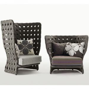 Ghế bành nữ hoàng SKLC061 ngoài trời có tựa lưng cao là dòng ghế có đặc điểm là đan xen, các dải sợi polyetylen màu trắng hoặc màu đồng thích hợp để không gian ngoài trời.