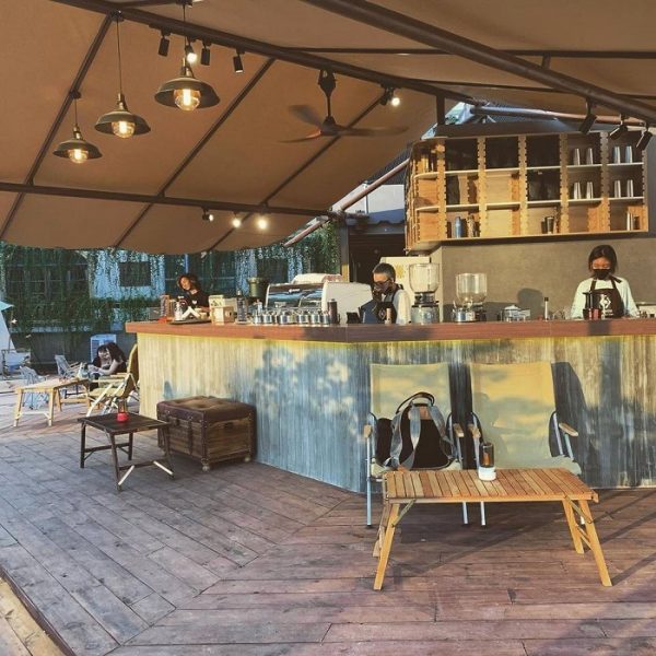 Đây là phong cách mới phổ biến dạo gần đây ở Việt Nam. Phong cách này bắt đầu phát triển từ khi những địa điểm ven sông được mở rộng, trở thành điểm du lịch, check in của giới trẻ. Đúng như tên gọi, quán cà phê theo phong cách cắm trại chú trọng việc bố trí không gian như một khu vực camping, có lều trại, dù quán cà phê giá rẻ, bàn ghế xếp,…