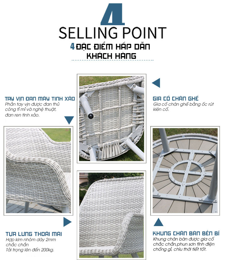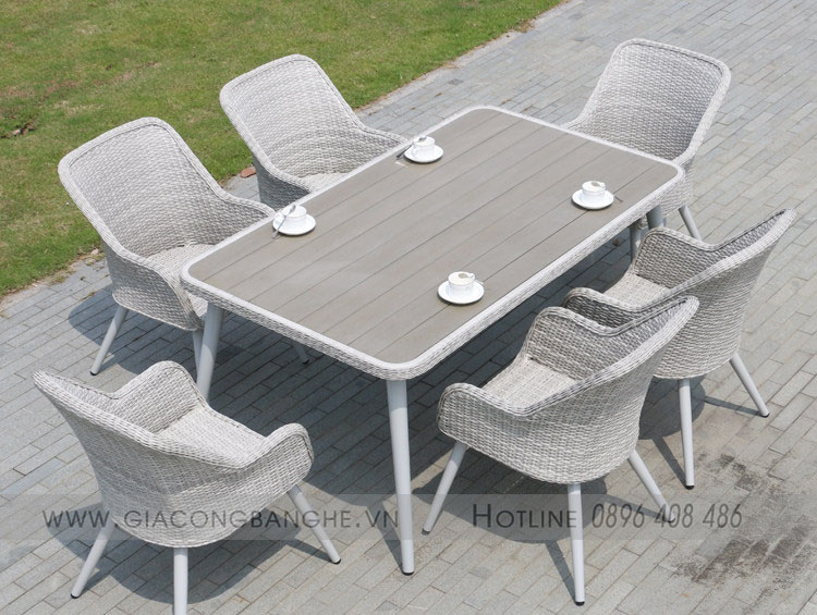 Chất liệu nhôm và mây được chuyên sử dụng ngoài trời với tính năng chịu thời tiết tốt, mặt bàn gỗ nhựa hoặc mặt kính cường lực, mây đan từ những thợ lành nghề tạo ra sản phẩm thẩm mỹ và chất lượng tốt nhất.