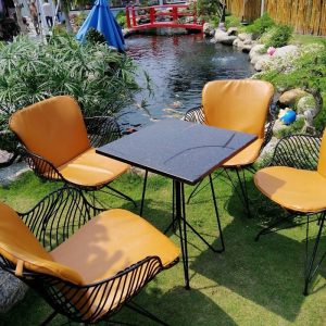 - Mặt bàn và ghế bằng sắt phun sơn tĩnh điện (Khách hàng có thể lựa chọn bằng đá, gỗ, kính cường lực, sắt…)